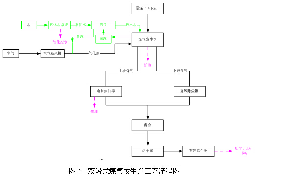 上段煤氣的產(chǎn)生:入爐原煤被氣化段產(chǎn)生的熱煤氣加熱首先失去內(nèi)外水分(90~150℃),繼而逐漸被干餾(150~550℃)脫出揮發(fā)分,揮發(fā)分成份為焦油、烷烴類氣體、酚及H2、CO2、CO、H2O混合物,其中,焦油、輕焦油隨上段煤氣進入電捕焦油器被去除,而烷烴類及H2、CO2、CO類做為干餾煤氣和氣化段產(chǎn)生的部分發(fā)生爐煤氣混合成為上段煤氣。