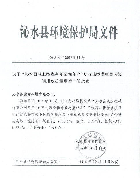 根據(jù)《山西省環(huán)境保護廳建設項目主要污染物排放總量核定辦法》晉環(huán)發(fā)[2015]25號文件,總量核定指標不包括無組織排放量,由以上分析知本項目總量控制指標為:粉塵0.95t/a,煙塵1.21t/a,SO2 2.96t/a,NOX 1.82t/a。2016年10月14日沁水縣環(huán)境保護局以沁環(huán)發(fā)[2016]51號文對該項目總量進行了批復。本項目運營期落實環(huán)評要求后可以滿足沁水縣環(huán)境保護局對本公司下達的總量控制指標。