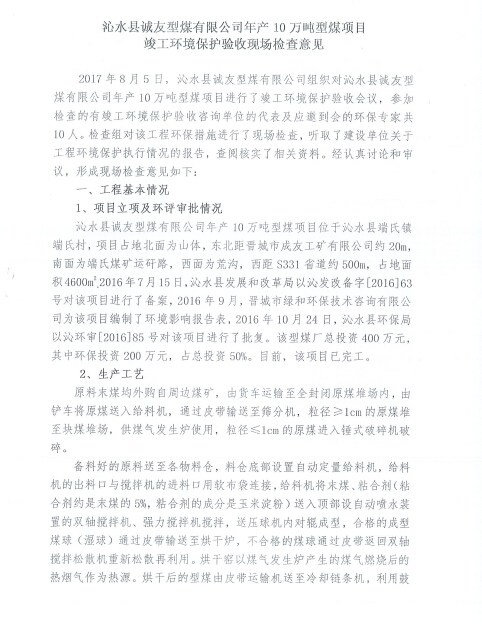 2017年8月5日,沁水縣誠友型煤有限公司組織對沁水縣誠友型煤有限公司年產(chǎn)10萬噸型煤項目進行了竣工環(huán)境保護驗收會議,參加檢查的有竣工環(huán)境保護驗收咨詢單位的代表及應邀到會的環(huán)保專家共10人,檢查組對該工程環(huán)保措施進行了現(xiàn)場檢查,聽取了建設單位關于工程環(huán)境保護執(zhí)行情況的報告,經(jīng)認真討論和審議后,提出以下要求及建議: