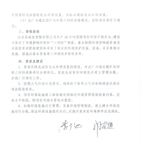 綜上所述,沁水縣誠友型煤有限公司在建設過程中已基本落實了環(huán)評及其批復要求,符合驗收條件和要求,可以予以驗收。